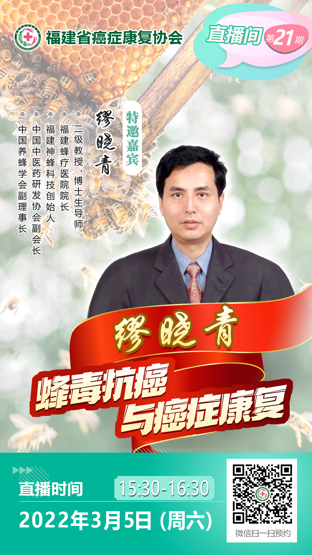 3月5日(周六)下午3:30,特邀中国中医药研发协会副会长、中国养蜂学会副理事长、国务院政府特殊津贴专家、福建神蜂科技创始人、福建蜂疗医院院长、二级教授、博士生导师缪晓青再次做客直播间。