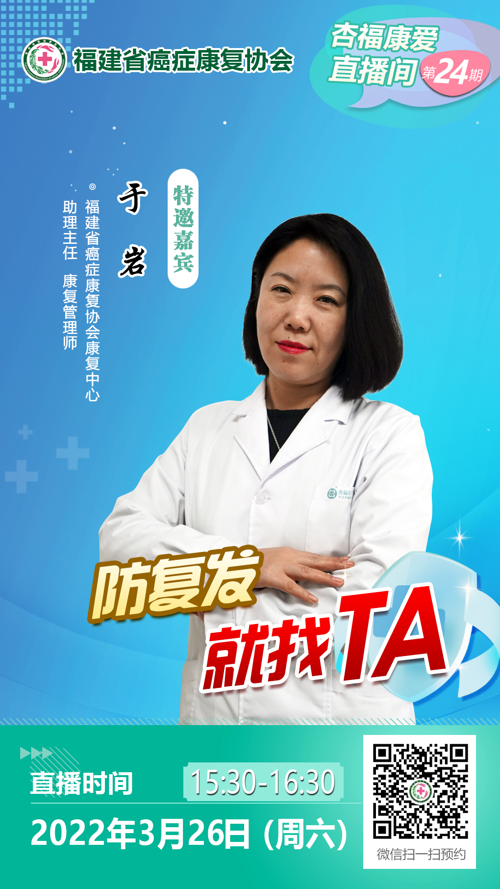 3月26日(周六)下午3:30,特邀福建省癌症康复协会康复中心助理主任、康复管理师于岩做客直播间。